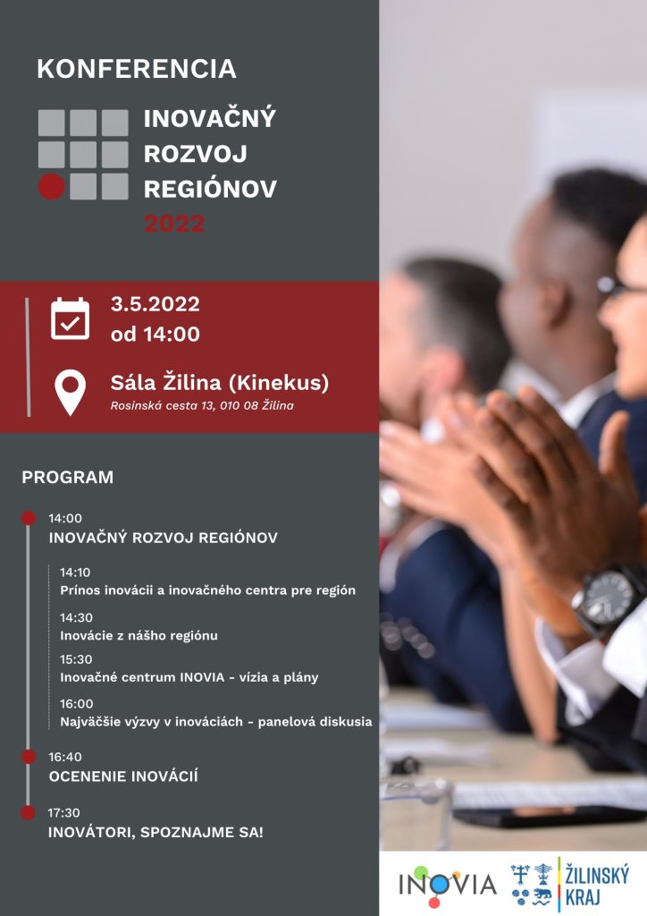 Podujatie Inovačný rozvoj regiónov IRR 2022 sa uskutoční v utorok 3. mája 2022 od 14.00 hod. v Sále Žilina (Kinekus, vchod B) na Rosinskej ceste 13 v Žiline.