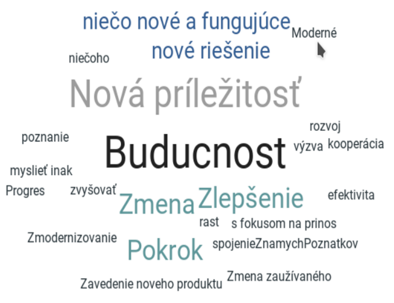 Účastníci konferencie neboli len pasívnymi prijímateľmi informácií – svojimi otázkami sa zapojili do diskusií a taktiež odpovedali cez mobilnú aplikáciu sli.do na otázku: „Čo pre Vás znamená inovácia?“ Odpovede sú zaznamenané v tomto word cloude a je z neho zrejmé že inovácie vnímajú účastníci ako budúcnosť, novú príležitosť, zlepšenie, pokrok.