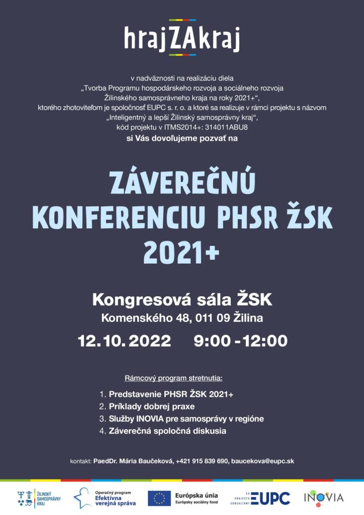Záverečná konferencia sa koná v nadväznosti na realizáciu diela „Tvorba Programu hospodárskeho rozvoja a sociálneho rozvoja Žilinského samosprávneho kraja na roky 2021+“, ktorého zhotoviteľom je spoločnosť EUPC s. r. o. a ktoré sa realizuje v rámci projektu s názvom „Inteligentný a lepší Žilinský samosprávny kraj“, kód projektu v ITMS2014+: 314011ABU8.