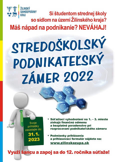 Žilinský samosprávny kraj vyhlasuje 12. ročník ocenenia “Stredoškolský podnikateľský zámer“. Prihlášky vo forme preddefinovaného formuláru je možné zaslať do 31. januára 2023.