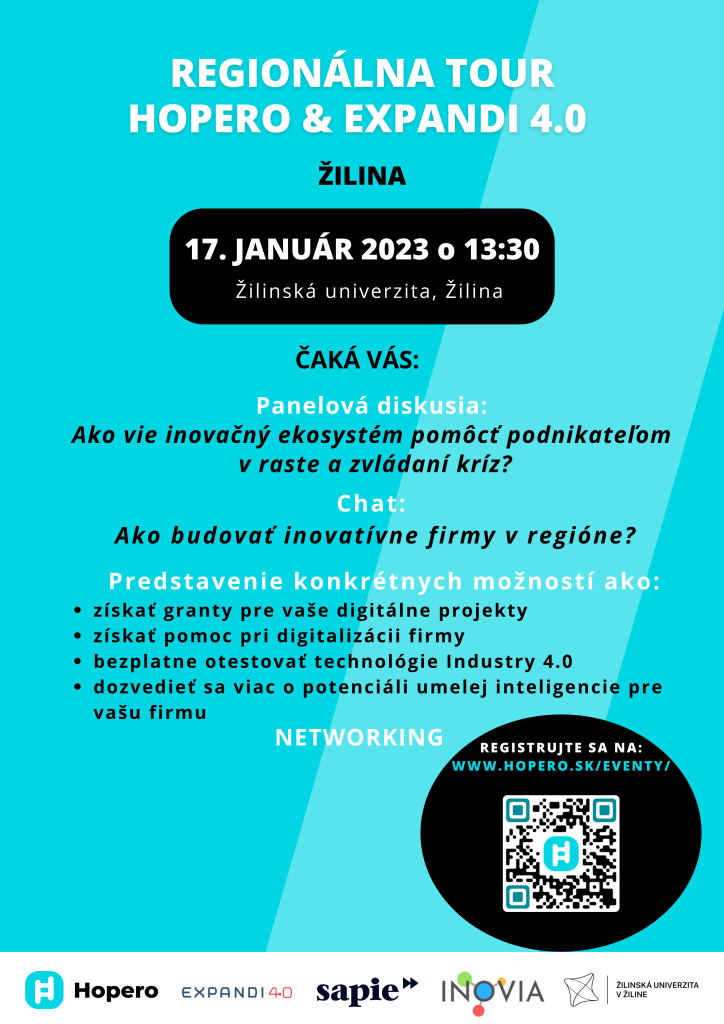 Odborníci na inovácie zo Slovenskej aliancie pre inovatívnu ekonomiku SAPIE navštívia 17. januára 2023 mesto Žilina v rámci Regionálnej inovačnej tour Hopero & Expandi 4.0 Žilina. Diskutovať sa bude o inováciách ako novom fenoméne regionálneho rozvoja, o možnostiach inovovania a digitalizácii v podnikoch.