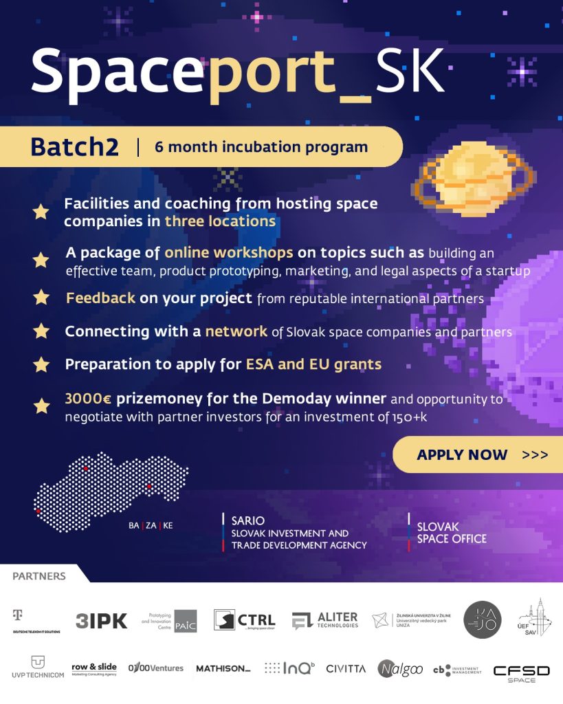 Ak máš vesmírny nápad/team/startup, pošli prihlášku vo forme 3 jednoduchých slidov venovaných teamu, problému a riešeniu + jeho inovatívnosti (prípadne celý pitch deck) do 31. januára na: denis.sedlak@sario.sk. Viac informácií na: https://spaceoffice.sk/spaceport-sk/, kde okrem iného nájdeš video so startupmi, ktoré vyhrali náš predchádzajúci Demo day a čo sa účastníci naučili počas minulého ročníka.