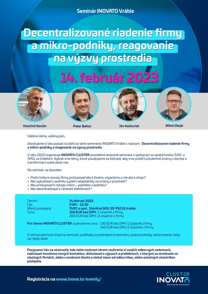 Dovoľujeme si Vás pozvať na ďalší zo série seminárov INOVATO Vráble s názvom: Decentralizované riadenie firmy, mikro-podniky a reagovanie na výzvy prostredia.