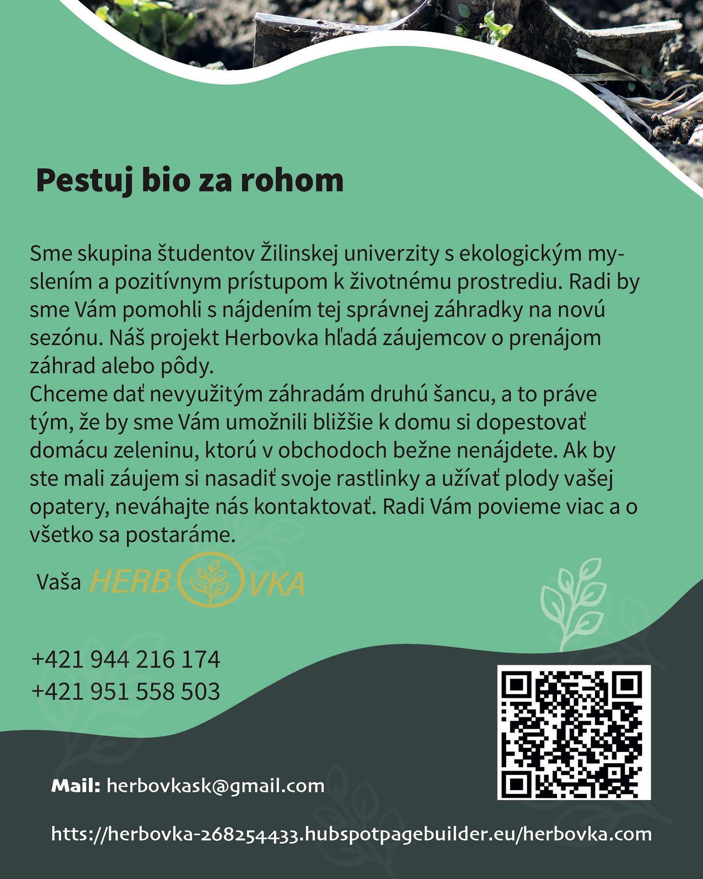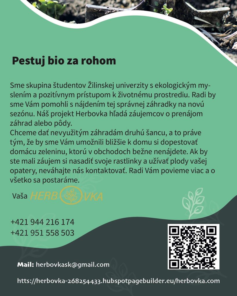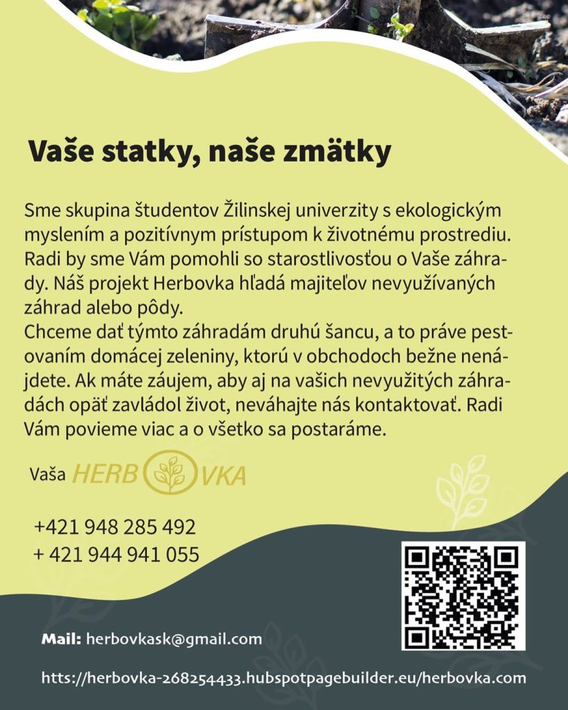 Máte zanedbanú záhradu či nevyužívaný pozemok, ale nemáte čas sa o to starať? Chcete záhradníčiť, no nemáte záhradku? Vhodné riešenie prináša startupový projekt Herbovka.