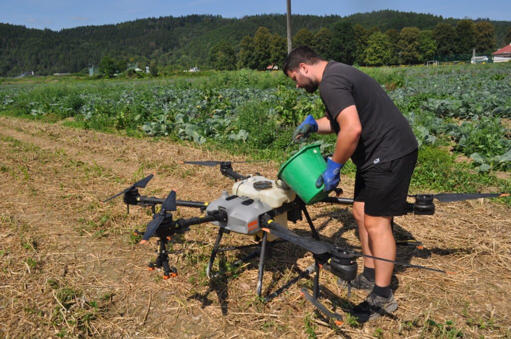 - Presná aplikácia pomocou dronu: Špeciálne hnojivo sa na obrovské lány kapusty neaplikuje tradičným postrekom, ale pomocou dronu. Ten lieta podľa vopred naprogramovaných trás a rovnomerne nanáša stimulant priamo na listy.