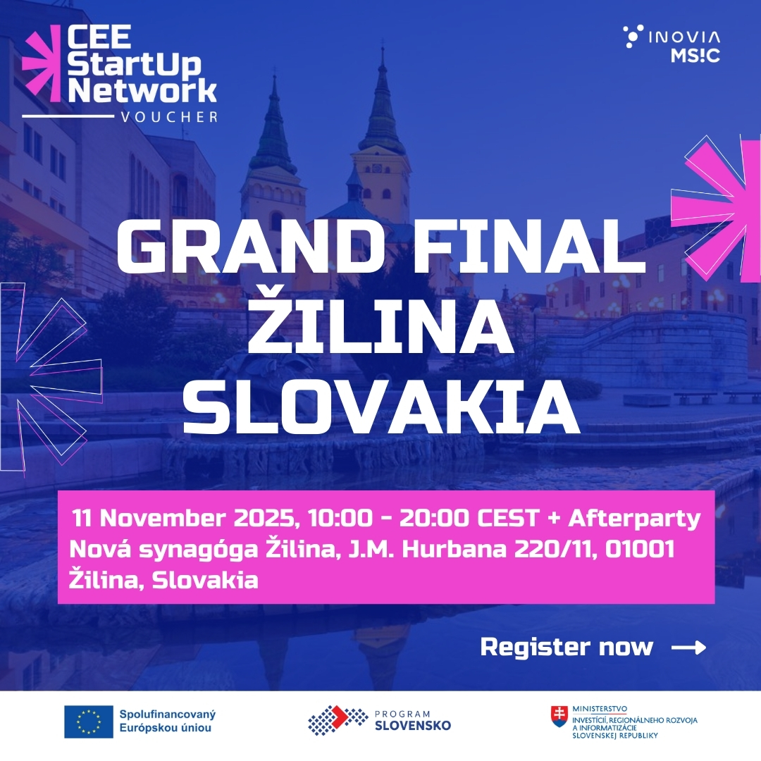 Nová synagóga J. M. Hurbana 220/11, Žilina, Slovenská republikaPríďte zažiť finále CEE Startup Voucher 2025 v Žiline – deň plný inšpirácie, skutočných príbehov zakladateľov, expertných insightov, networkingu s investormi a mentormi, pitchingu TOP startupov z CEE regiónu a nezabudnuteľnej afterparty. Získajte know-how, inšpiráciu a cenné kontakty.